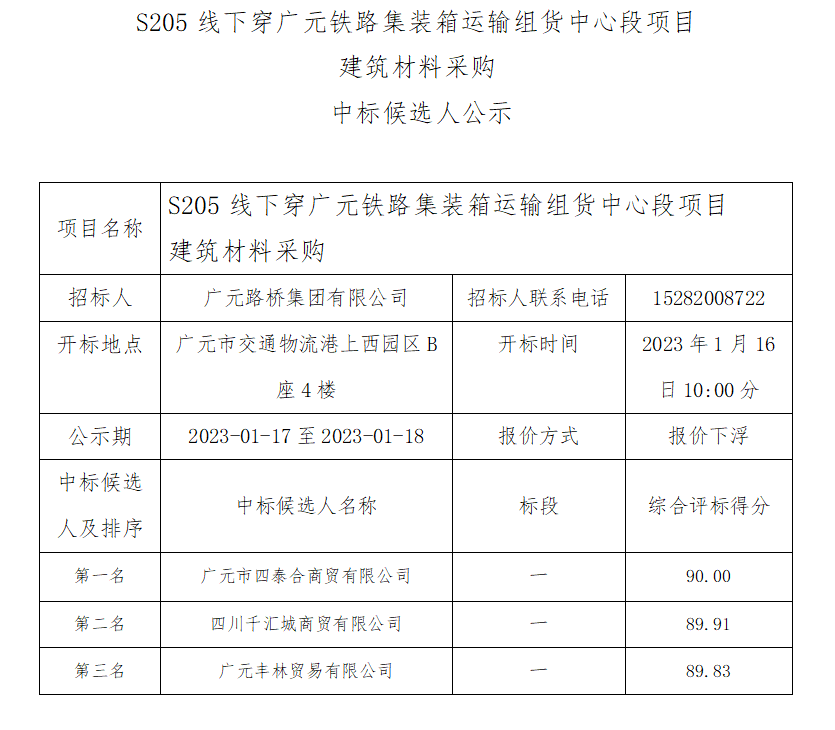 廣元路橋集團(tuán)有限公司S205線下穿廣元鐵路集裝箱運輸 組貨中心段項目建筑材料采購中標(biāo)候選人公示