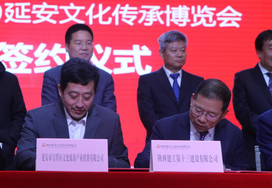 陜西建工第十三建設有限公司董事長(右)與延安市寶塔區(qū)文化旅游產業(yè)投資有限公司董事長米強(左)代表雙方簽約。