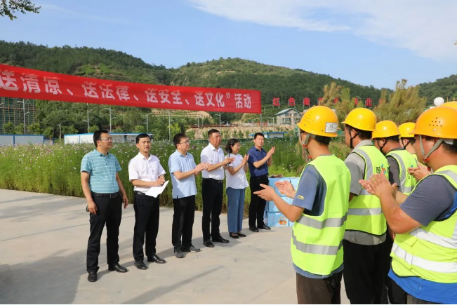8月10日,延安市政協(xié)副主席、市總工會黨組書記、主席黑樹林一行來到陜建十三建公司南泥灣紅色文化小鎮(zhèn)項(xiàng)目慰問項(xiàng)目一線建設(shè)者,為他們送去茶葉、蜂蜜、綠豆、小米等防暑降溫物品。市總工會副主席、女職委主任鄭艷霞,南泥灣開發(fā)區(qū)黨工委副書記折克銀,市總工會辦公室副主任、困難職工幫扶中心主任惠瑞國,市總工會辦公室副主任、宣教部負(fù)責(zé)人康靖華,陜建十三建公司紀(jì)委書記、工會主席張軍祥出席活動。