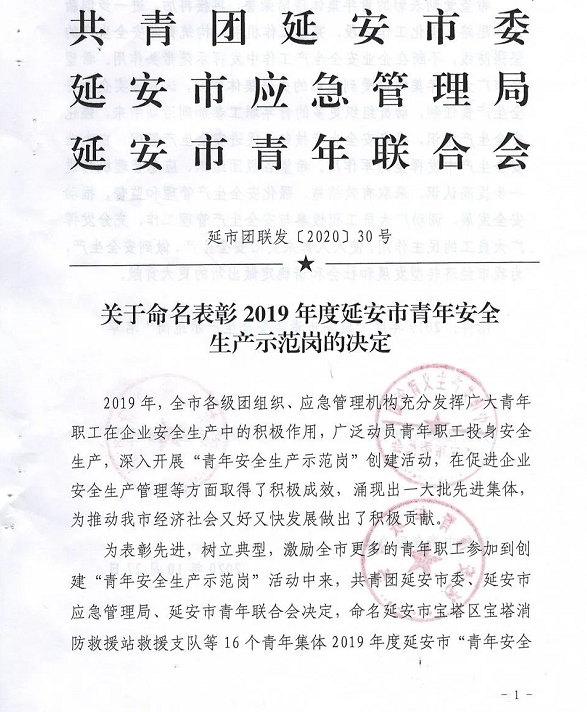 | 公司多個(gè)集體榮獲“延安市青年安全生產(chǎn)示范崗”稱號(hào) |