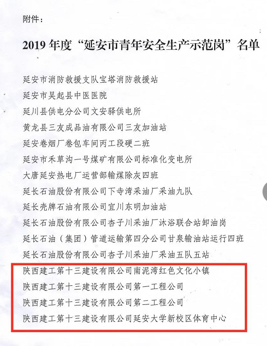 近日,共青團(tuán)延安市委、延安市應(yīng)急管理局、延安市青年聯(lián)合會(huì)聯(lián)合下發(fā)《關(guān)于命名表彰2019年度延安市青年安全生產(chǎn)示范崗的決定》,陜建十三建公司第一工程公司、第二工程公司、南泥灣紅色文化小鎮(zhèn)項(xiàng)目部、延安大學(xué)新校區(qū)體育中心項(xiàng)目部四個(gè)集體榮獲2019年度“延安市青年安全生產(chǎn)示范崗”榮譽(yù)稱號(hào)。