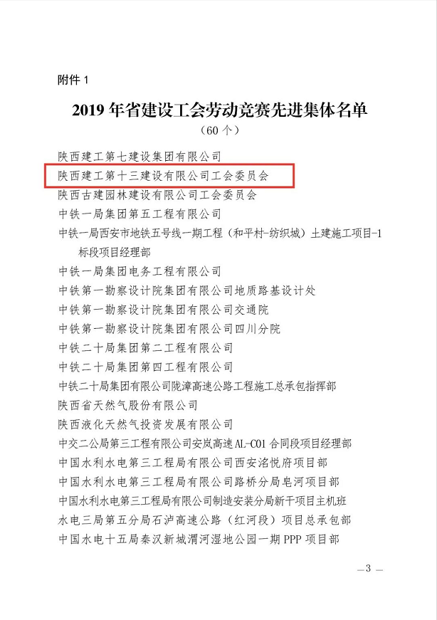 日前,陜西省建設(shè)工會通報表彰2019年勞動競賽和助力脫貧攻堅競賽先進(jìn)集體、先進(jìn)個人。陜建十三建公司工會委員會榮獲“2019年陜西省建設(shè)系統(tǒng)勞動競賽先進(jìn)集體”稱號。