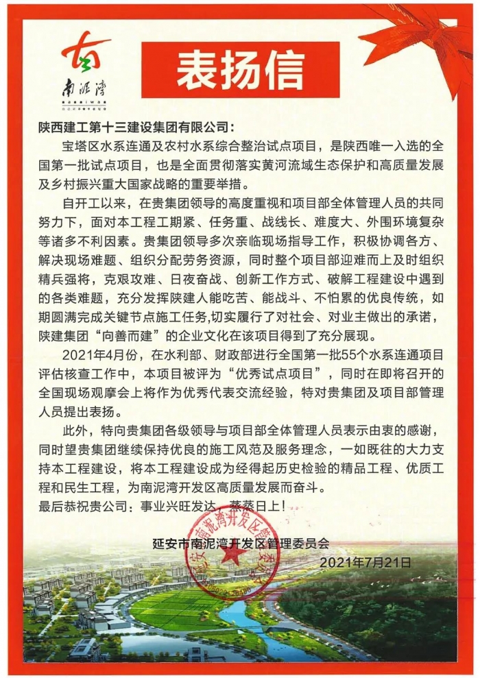 近日,陜建十三建集團(tuán)收到了來(lái)自南泥灣開發(fā)區(qū)管委會(huì)的表?yè)P(yáng)信。信中,對(duì)集團(tuán)寶塔區(qū)水系連通及農(nóng)村水系綜合整治試點(diǎn)項(xiàng)目全體管理人員表示了高度贊揚(yáng)。