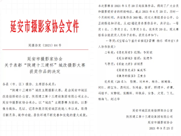 “陜建十三建杯”城改攝影比賽旨在用相機(jī)展示古城風(fēng)貌,以鏡頭凸顯圣地氛圍,展現(xiàn)新時代之下延安市的發(fā)展之美、和諧之美。影賽自開展以來,得到了廣大攝影愛好者的積極參與、踴躍投稿,共收到攝影作品350余幅,經(jīng)過攝影協(xié)會專業(yè)評委嚴(yán)格公平評選,共評選出一等獎作品1幅,二等獎作品2幅,三等獎作品3幅,優(yōu)秀作品20幅。