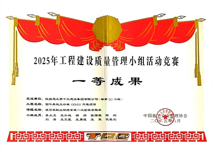 近日,中國施工企業(yè)管理協(xié)會公布了“2025年工程建設(shè)質(zhì)量管理小組成果大賽”獲獎名單,集團(tuán)國華吳起五谷城100MW風(fēng)電項目“緣夢QC小組”參賽成果《提高裝配式砼塔安裝一次驗收合格率》獲得大賽一等獎。